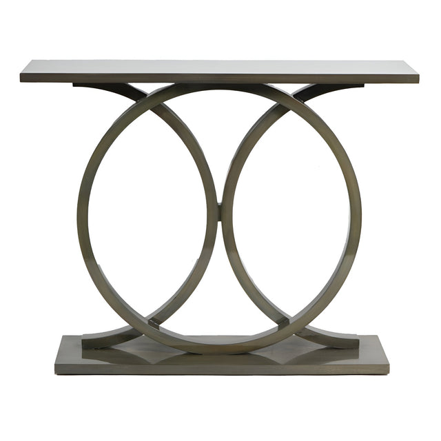 The Lacquer Console Table in Olive & Bronze is a bold design statement for interiors that embrace strong sculptural lines. Crafted in wood with a smooth lacquered finish, it features an intersecting double-circle base that adds architectural presence to any room. The olive-toned tabletop pairs effortlessly with the warm bronze base, creating a palette that feels both earthy and refined. This console is ideal for entryways, living rooms, or hallways where space is limited but impact is desired. The geometric silhouette gives the piece a distinctly modern edge, while the subtle metallic tones soften the overall look. Whether styled with a contemporary lamp or a cluster of curated objects, this table is designed to draw the eye without overwhelming its surroundings. Its artistic form and sleek surface lend versatility to a range of décor schemes, from minimalist to transitional, making it a standout piece with functional appeal.