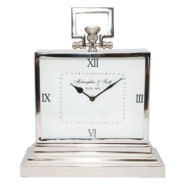 The Latham Small Rectangular Mantel Clock in Silver is a refined timepiece that combines classic design with modern elegance. Crafted from polished aluminium, it features a stepped plinth base and a large face adorned with Roman numerals, all finished in a sleek nickel tone. Measuring 32.5 cm in width, 16 cm in depth, and 38 cm in height, this clock is an ideal addition to various interior styles, from contemporary to traditional. Its compact size makes it suitable for placement on desks, shelves, or mantelpieces, adding a touch of sophistication to any room. The clock operates on a single AA battery (not included) and produces a gentle ticking sound, adding to its nostalgic charm.