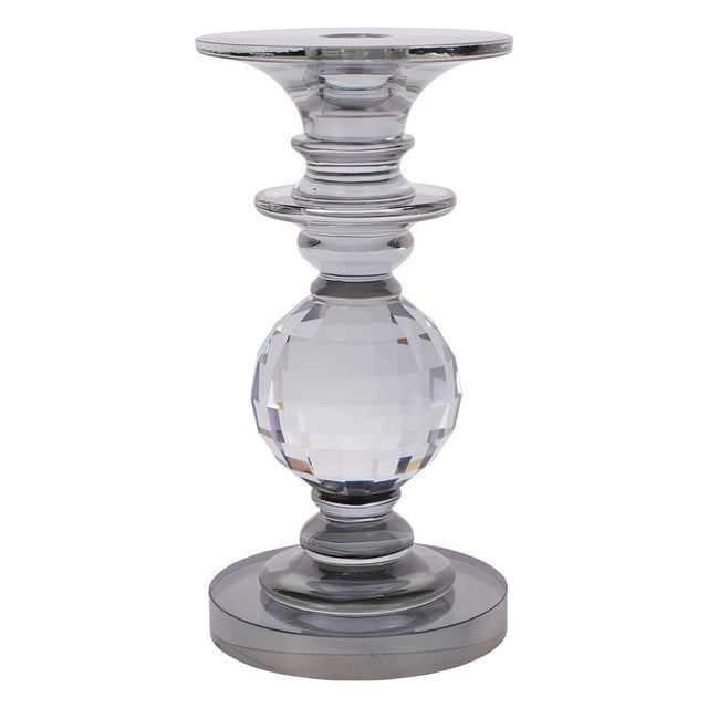 Standing at 19.5 cm tall, this elegant pillar candle holder features a beautifully faceted glass crystal design that reflects light, creating a stunning visual effect. The sleek base enhances its timeless appeal, making it a versatile addition to any room. Ideal for holding taper candles, it is perfect for special occasions, dinner settings, or adding a touch of everyday luxury to your home. Available in two sizes 26.5 and 19.5cm.