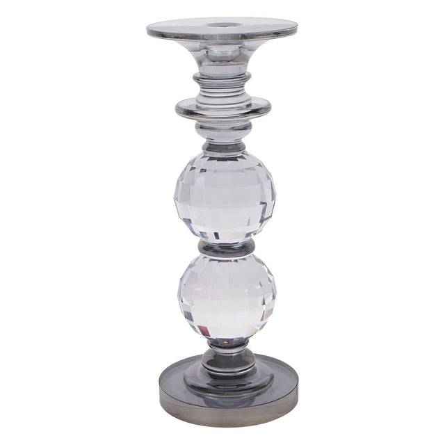 Standing at 26.5 cm tall, this elegant pillar candle holder features a beautifully faceted glass crystal design that reflects light, creating a stunning visual effect. The sleek base enhances its timeless appeal, making it a versatile addition to any room. Ideal for holding taper candles, it is perfect for special occasions, dinner settings, or adding a touch of everyday luxury to your home. Available in two sizes 26.5 and 19.5cm.