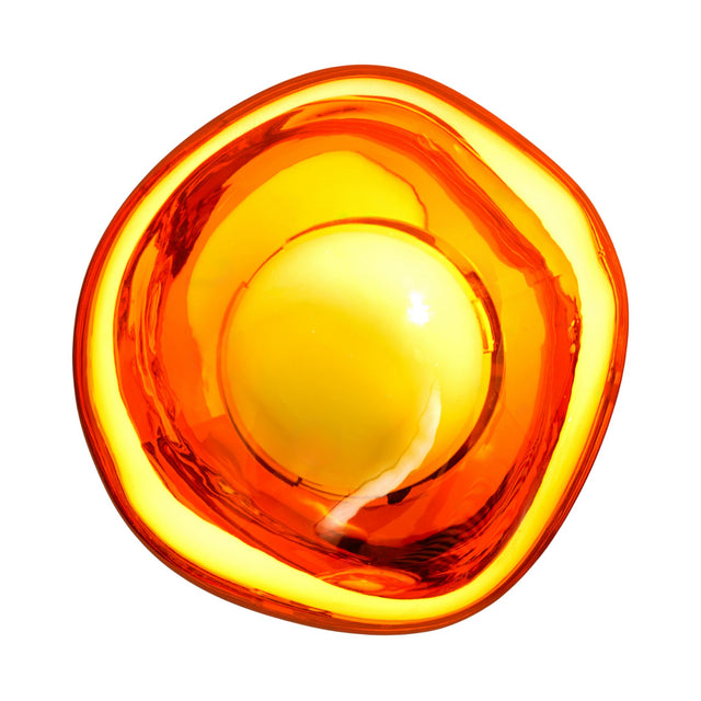 Looks like polished metal when unlit; switch it on and the shade glows lava-like from within - one fixture, two dramatic moods.
