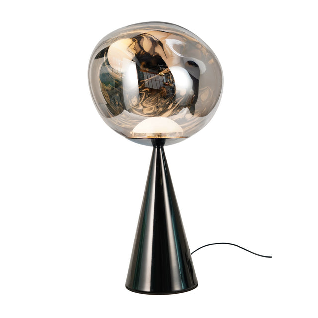Looks like polished metal when unlit; switch it on and the shade glows lava-like from within - one fixture, two dramatic moods.