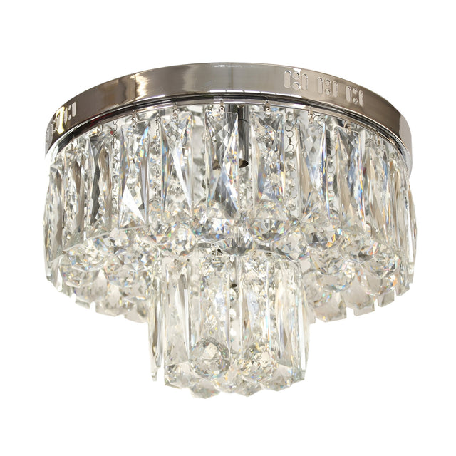 The drum-style composition creates a halo of faceted texture, diffusing brightness through precisely cut crystal surfaces. The chrome canopy introduces a clean metallic edge that grounds the chandelier’s decorative detail in architectural clarity. Ideal for bedrooms, smaller dining areas, or transitional rooms, this flush-mounted format introduces contrast and rhythm without visual bulk.