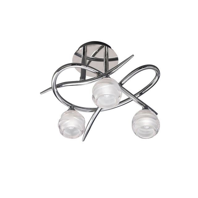The Loop 3 Light Semi Flush Ceiling Light in Polished Chrome is a semi flush ceiling light shaped with intertwining metal curves and refined glass spheres, forming a sculptural focal point ideal for contemporary interiors. Its polished chrome finish enhances the fluid geometry, catching surrounding light to create subtle reflective highlights that emphasise the sweeping motion of the design. Positioned along the looping framework, three frosted and clear glass globes introduce soft diffusion and ambient lighting, enriching living rooms, dining spaces, bedrooms, hallways and lounges with a gentle, warm atmosphere.