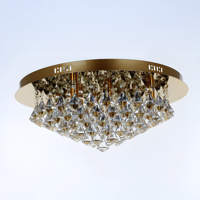 The Luma 8 light crystal flush light in gold merges geometric glamour with compact proportions, making it a standout ceiling piece for mid-sized rooms. Suspended from a gold-toned frame, its faceted crystal prisms are arranged in diamond-like tiers, reflecting ambient light with warmth and brilliance. The gold finish enriches the tone of the light, casting a golden glow that works beautifully in richly coloured interiors, vintage-inspired rooms, or spaces layered with brass accents and velvet upholstery. Despite its lower profile, this flush fixture delivers a luxurious lighting effect that mimics the impact of a chandelier without the drop. It’s particularly suited to bedrooms, formal lounges, or elegant hallways where space is limited but visual drama is desired.