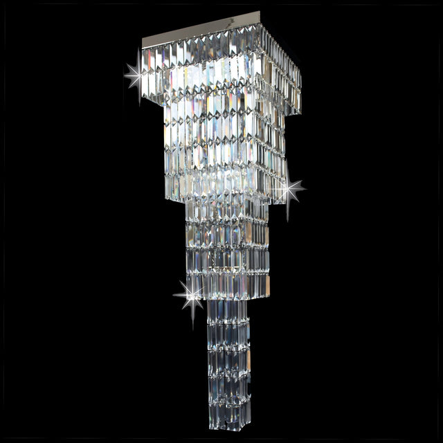 Designed to captivate in grand stairwells or multi-level entrances, the Luminique 4 Light Cascade Crystal Flush Chandelier in Chrome offers dramatic vertical elegance. A gleaming chrome base anchors a striking column of rectangular crystals, cascading downward in a rigid, geometric formation. The tiered crystal arrangement refracts light with precise brilliance, delivering a sculptural drop that balances symmetry with grandeur.