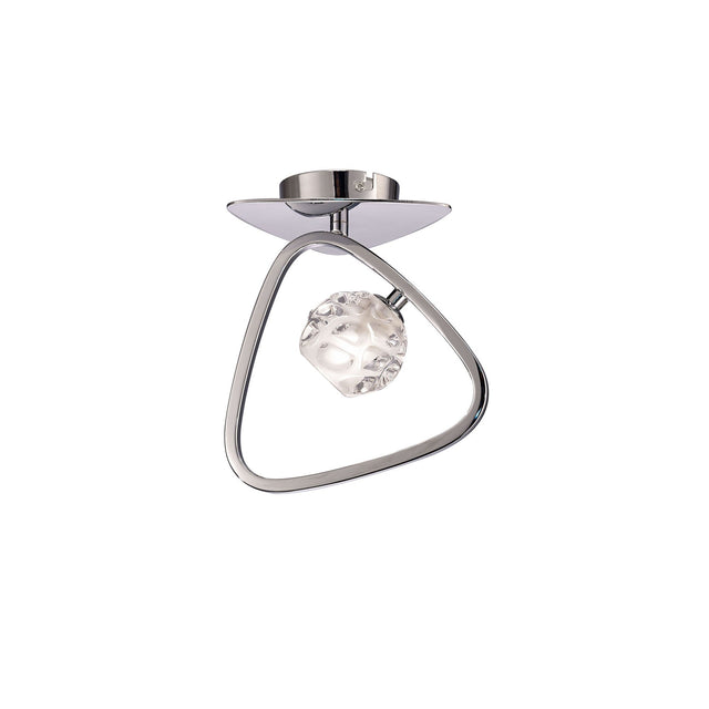 The Lux 1 Light Flush Ceiling Light presents the essence of the Lux collection in its most compact and minimalist form. As a polished chrome flush fixture, it features a single carved glass shade supported by a refined triangular metal structure, offering modern decorative lighting that suits smaller spaces or layered lighting plans.
