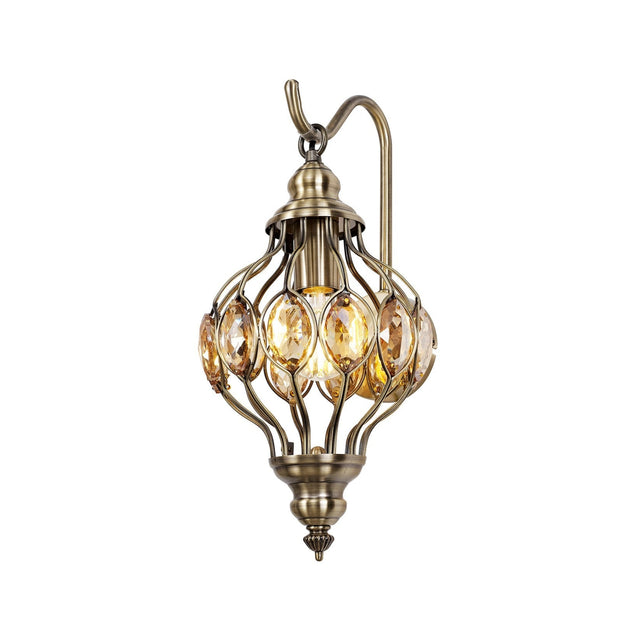 The Marisa 1 Light Amber Crystal Wall Light in antique brass brings exotic elegance to interior lighting. Inspired by Middle Eastern lantern designs, this fixture features a delicately woven antique brass frame surrounding stunning amber crystal leaves. The intricate metalwork extends seamlessly along the suspension chain, with alternating oval and waved links that enhance the lantern-inspired style. When illuminated, the amber crystal elements cast a warm, golden glow, creating an inviting and luxurious atmosphere. Perfect for bedrooms, hallways, or living rooms, the Marisa wall light makes a striking decorative statement while offering soft ambient illumination. Its combination of antique brass and rich amber crystal creates an opulent yet timeless feel that suits both traditional and eclectic interiors. Ideal for those who appreciate handcrafted detailing and distinctive character in their lighting, the Marisa range transforms any wall into an artistic focal point with warmth and sophistication.