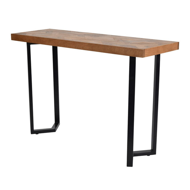 Traditional rectangular compact console table on contrasting industrial powder coated black legs featuring geometric inlay design. As a 122cm length table, this is a great solution for hallways and smaller spaces. We chose mango wood due to its fast growing, durable eco credentials. As a bi-product of fruit production this wood is kind on the world and its unusual colouration ensures no two tops are alike.