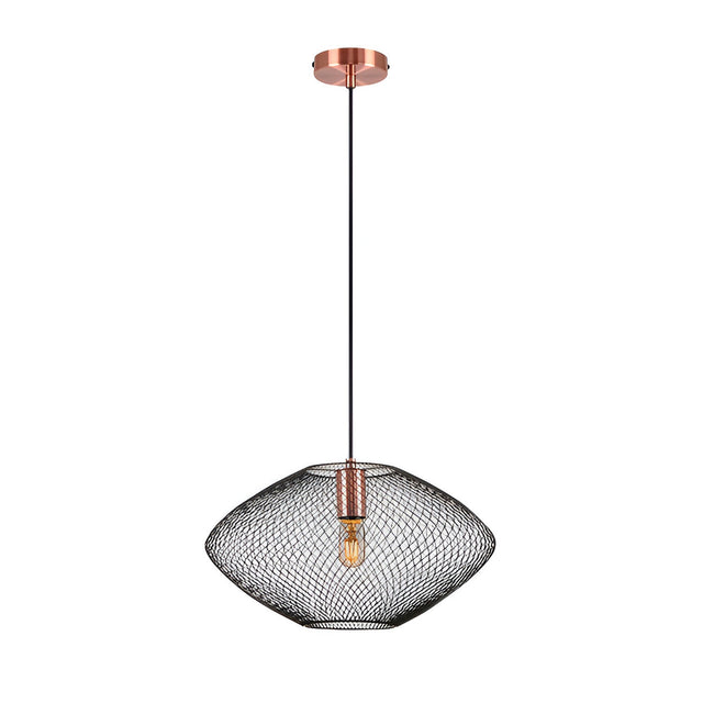 Striking and sculptural, the Melany pendant light offers a bold take on ambient lighting with its wide mesh shade and refined copper detailing. Crafted from durable metal, the shade is formed from a fine black mesh that allows light to softly diffuse through the surface, casting intricate shadows that add movement and depth to your space. At the center, a satin copper fitting introduces a warm metallic accent that stands out against the matte black frame.