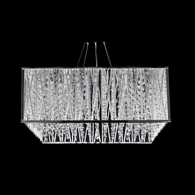 Compact in scale but rich in detail, the Melden 5 Light Suspension brings sculptural elegance to dining spaces, lounges, or bedrooms. Its boxy chrome frame supports a shimmering curtain of crystal strands, creating an interplay of vertical geometry and light refraction. The form is clean and structured, while the inner crystal detailing adds depth and movement.