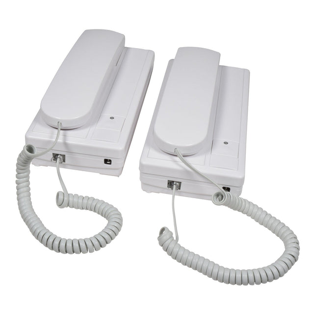 A compact, energy-efficient audio intercom system designed for clear 2-way communication between two points within a property. Ideal for both wall-mounted or free-standing use, this unit operates via a simple two-wire connection and runs on AA batteries, making it a versatile option for offices, flats, and small homes. The system includes a call button with adjustable tone volume and brackets for mounting. It also features an 8m connection cable and supports up to 200m transmission with suitable wiring.