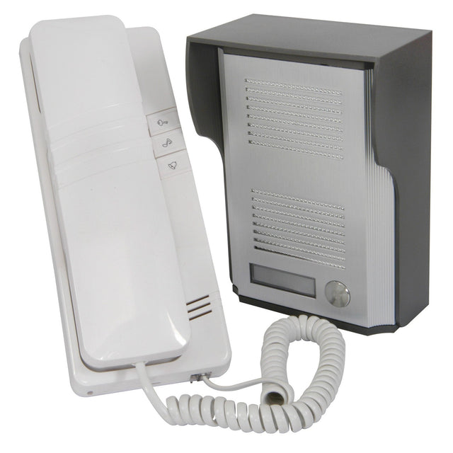 A practical door phone system for homes and small businesses, providing reliable audio communication before entry. The system features a robust outdoor call station and a wall-mounted indoor handset with clear audio and 16 ringtone options. The backlit nameplate on the outdoor unit ensures visibility, while an electronic lock release output allows entry control. The system supports up to 100m cable length using standard 2-core wiring (cable not included). Ideal for elderly users or secure premises needing direct communication with visitors.
