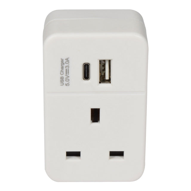Designed for flexibility in modern households, this Mercury plug-through adaptor converts a UK socket into a dual-purpose charging hub. It includes a 13A fused socket plus one USB A and one USB C port, both supporting fast charge via PD technology. Ideal for integrating charging stations into tight spaces, this compact solution fits directly into a UK wall outlet while still providing access to a conventional socket for existing appliances. The USB ports offer combined output up to 15W and are compliant with BS1363 and BS EN 62368-1 safety standards. Use it to charge smartphones, tablets, and other USB-powered devices without sacrificing socket availability. With its clean white casing and vertical layout, it’s designed for minimal intrusion in home or office environments.