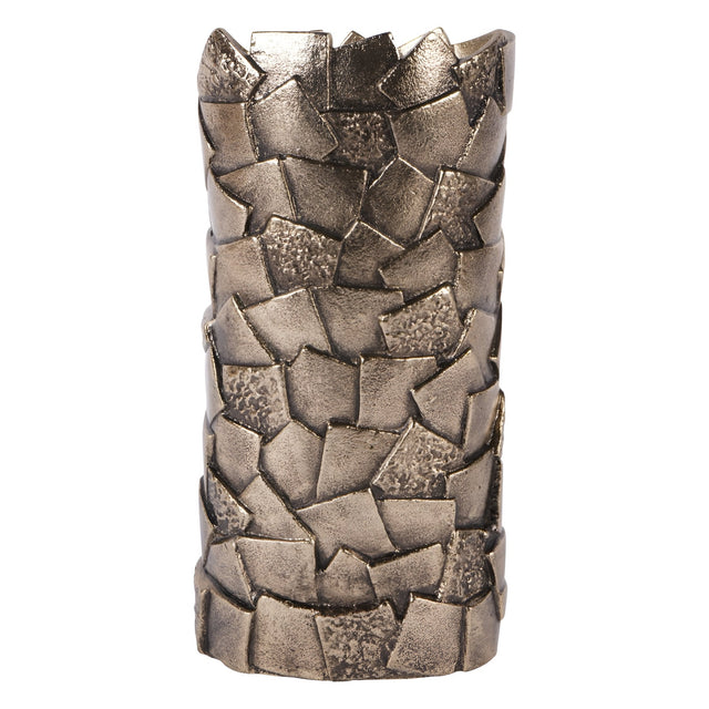 The Montrose Vase stands 36cm in height and is a striking piece crafted from antique brass cast aluminium. Its design features a unique arrangement of random square segments, seamlessly joined together to create an elegant, sophisticated form. Each vase is meticulously handcrafted by skilled artisans, ensuring that no two pieces are alike. This vase is part of the Montrose collection, which also includes decorative bowls, platters, and photo frames. This range is for decorative use only; it is not water-safe.