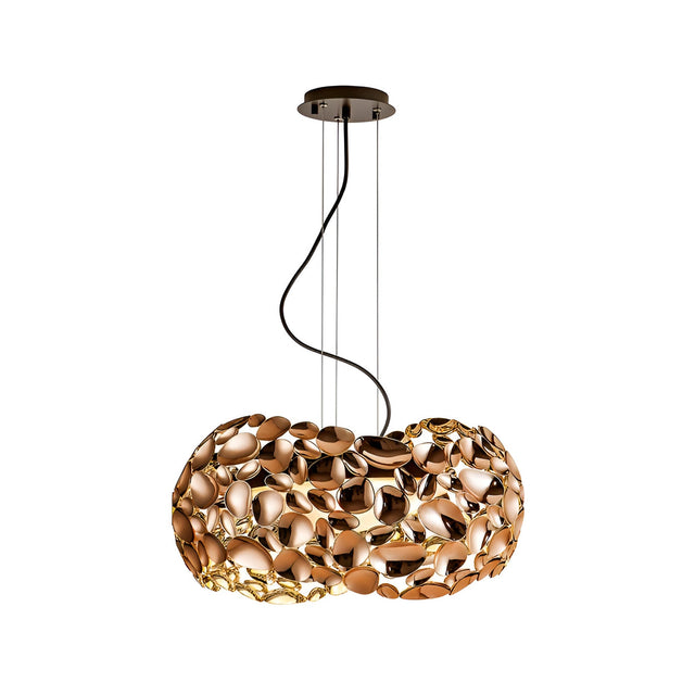 The Narisa 5 Light Pendant in rose gold combines sculptural form with luxurious finish. Composed of intertwining metal bands plated in rose gold and accented with dark brown paint, this pendant light evokes movement and flow. The inner acrylic diffuser softens the light, creating an ambient effect that’s equally suited to living rooms, kitchen islands, or bedrooms. The adjustable height ensures tailored installation for both intimate and open-plan settings. With its statement-making presence and polished finish, the Narisa pendant enhances interiors where elegance and creativity intersect. A refined lighting piece that pairs beautifully with gold accents, mid-century furniture, or neutral tones. This item includes 5 G9 LED 6W bulbs.