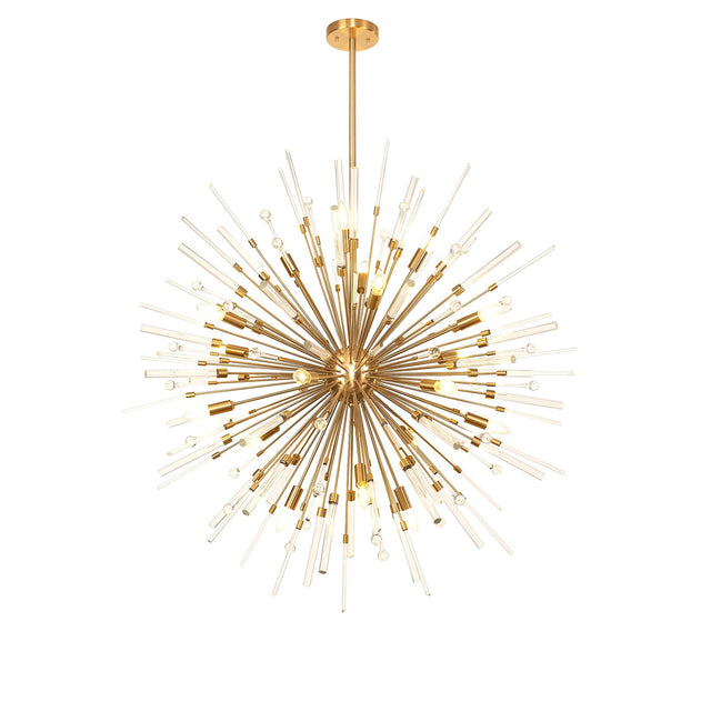 The Noon 20 Light Glass Pendant Light in antique gold reveals a dramatic composition centered around a sphere of clear glass elements arranged with radial precision. At 1250 millimeters in diameter, the pendant commands attention through its expansive form and the density of its glass arrangement. Cylindrical glass tubes introduce clarity and structure, while elongated droplet shaped pieces extend outward, creating visual movement and a nuanced three dimensional surface. The antique gold finish enriches the framework with a warm reflective tone that enhances the depth of the glass. This finish extends across the suspension components, unifying the pendant’s vertical presence and bringing coherence to the overall silhouette. The generous height supports the pendant’s ability to stand as a sculptural feature.