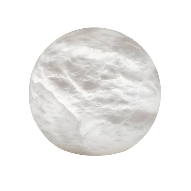 The soft white finish maintains a contemporary design aesthetic, allowing the alabaster to stand at the centre of the visual composition. Subtle shifts in translucency animate the surface as the lamp glows, creating an inviting ambience. The circular silhouette introduces calming geometry that works harmoniously with minimalist interiors while complementing layered decorative styles.