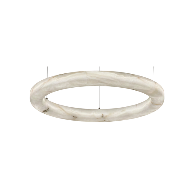 The light’s soft diffusion creates a warm atmosphere that flows evenly, highlighting surrounding materials and surfaces while avoiding sharp contrasts. Its shape reads as a floating ring of luminous stone, offering visual impact and versatility. The result is an ambient lighting piece that enriches the aesthetic of minimalist, modern luxury or natural-toned interiors.