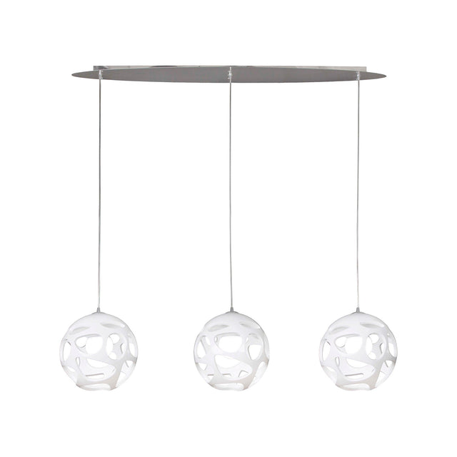 The Organica 3 Light Bar Pendant Light in Gloss White and Polished Chrome draws inspiration from natural coral formations, translating organic textures into a refined, sculptural design. Each pendant features a globe-like structure with delicate cutouts that mimic porous marine surfaces. When illuminated, the pattern casts intricate, soothing shadows that transform the surrounding environment into a dynamic interplay of light and texture. The white polymer shades balance transparency with opacity, creating a tranquil glow complemented by polished chrome detailing. Designed for both aesthetic and atmospheric impact, this pendant delivers artistry through precision. The composition offers equal presence when lit or unlit, textural during the day and ethereal by night. Organica merges natural inspiration with architectural finish, making it ideal for modern interiors seeking calm sophistication and a sense of organic continuity.