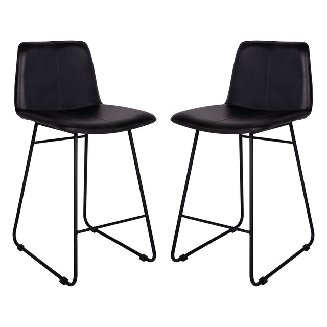 Pair of high quality leather bar stools featuring black powder coated metal frames and hand stitched leather upholstery available in cognac or charcoal colours. Seat height 68cm x width 48cm x depth 43cm. Robinson collection features dining chairs and bar stools.