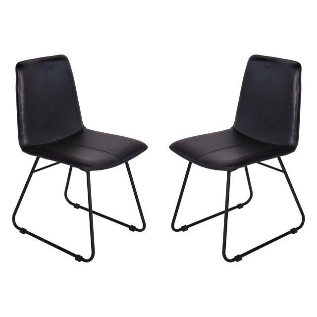 Pair of high quality leather dining chairs featuring black powder coated tubular metal frames and hand finished leather upholstery with central stitching detail, available in cognac or charcoal colours. Seat height 48cm x width 48cm x depth 43cm. Robinson collection features dining chairs and bar stools.