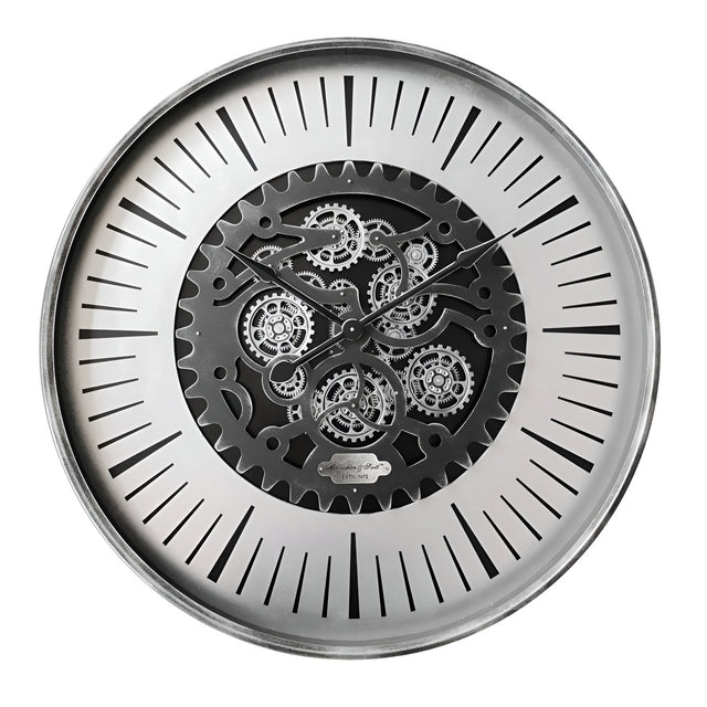 Introducing our Palladium Black Nickel Wall Clock 100cm, blending elegance with functionality. This striking timepiece boasts a bright silver/grey hue and mesmerising moving cogs. The face reveals intricate gears, complemented by sleek unnumbered hour markers for a refined aesthetic. Ideal for living rooms or bedrooms, it adds contemporary sophistication to any space. Mix and match with other items from the Palladium range for a cohesive look. For indoor use only, it requires 3 AA batteries (not included). Dimensions: W100 x D8 x H100 cm.