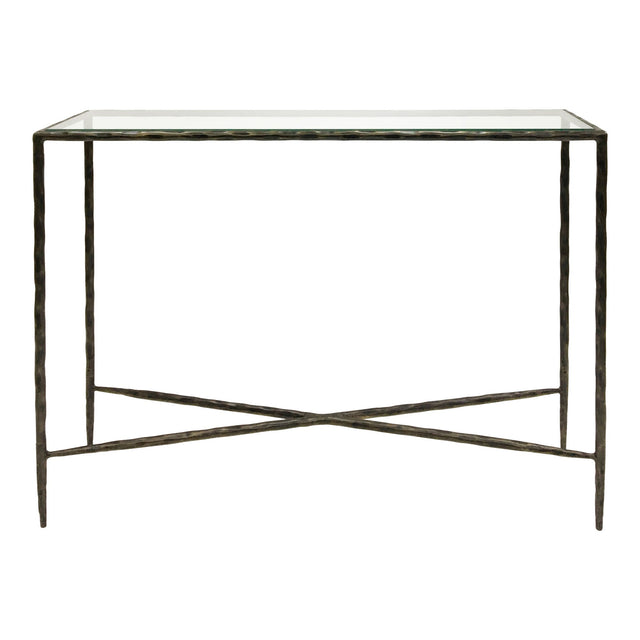 Enjoy a console table crafted with sheer quality in mind with this Patterdale console table in dark bronze. A clear glass top is framed by the dark bronze legs, which is a warming tone that works perfectly in most contemporary design schemes. The Patterdale small console table is just 110x30cm making it perfect for hallways in the home. Also available in oak wood, brushed grey and aged champagne finishes.