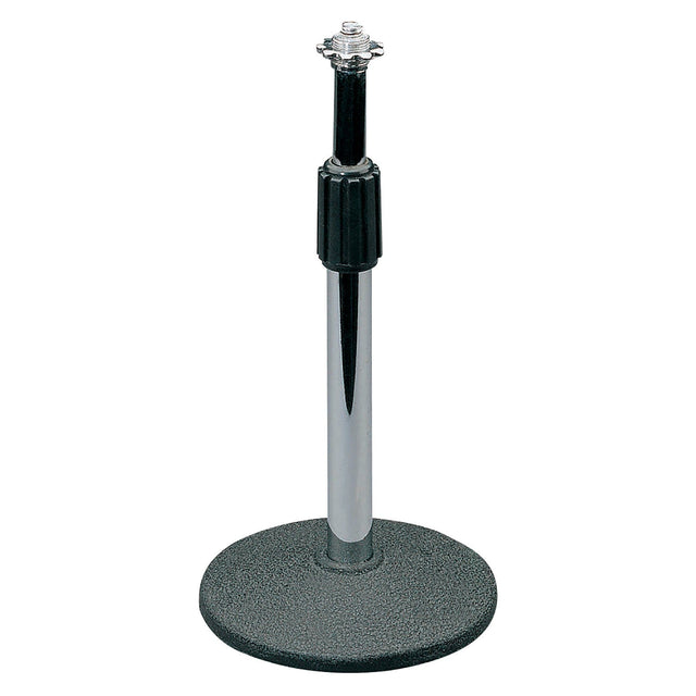 The QTX Telescopic Microphone Stand Table combines adjustability with a solid, space-efficient design, making it ideal for desktop recording, podcasting, and broadcasting. Its telescopic height adjustment allows positioning between 230mm and 380mm, offering flexibility for different seating arrangements or recording angles. The heavy, weighted base ensures stability while reducing vibration transfer, helping maintain clean, professional-quality recordings. Finished in black metal with chrome accents, it offers both durability and a professional aesthetic. The standard 5/8" thread accommodates most microphone holders and shock mounts, making it compatible with a wide range of equipment. Rubber feet on the base prevent slipping and protect surfaces from scratches, while the compact design ensures it won’t clutter your workspace. Whether you’re recording voiceovers, hosting online meetings, or setting up a desktop streaming station, this stand delivers dependable performance. Its robust build quality ensures long-term use, while its adjustable design allows for quick repositioning during recording sessions.