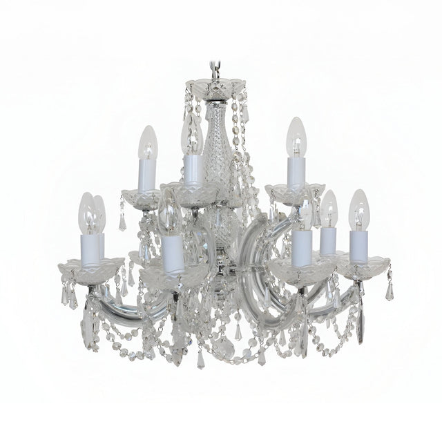 The Queenlight 12 Light Armed Glass & Czech Republic Crystal Chandelier in chrome is a centerpiece of refined proportion and enduring brilliance. Its twelve sculpted armed glass arms radiate from a polished chrome column, each arm adorned with Czech Republic crystal droplets that refract light with precision. The arrangement produces multidirectional illumination, perfect for enhancing formal living spaces, dining rooms, or grand staircases.