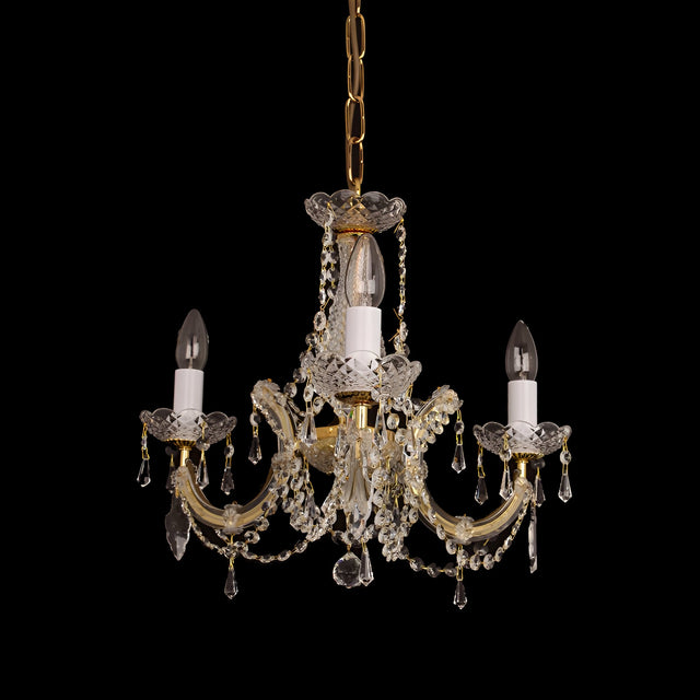 The Queenlight 3 Light Armed Glass & Czech Republic Crystal Chandelier in gold showcases refined craftsmanship in a compact, graceful form. Three armed glass arms curve elegantly from a gold-finished frame, each adorned with Czech Republic crystal accents that sparkle with refined luminosity. The warm metallic tone complements both classical and transitional interiors, lending depth and richness to smaller rooms.