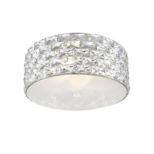Perfect for living rooms, bedrooms, or transitional hallways, the wide drum form brings ambient warmth without visual bulk. The layered crystal surface diffuses light evenly across walls and ceilings, while the chrome detailing introduces contrast and definition. Its flush design is particularly well-suited for interiors where ceiling clearance is limited but decorative impact is desired.
