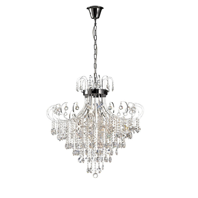 The Rosina chandelier showcases intricate craftsmanship with a refined balance of crystal and metal. Its polished chrome frame features gracefully curved arms that extend outward in a symmetrical pattern. Each arm supports G9 lampholders surrounded by cascading strands of crystal buttons and discs, forming a brilliant waterfall effect. The upper curves are adorned with crystal disks, while the lower arcs are finished with 30mm crystal balls, adding depth and texture. Designed with precision, Rosina captures light beautifully, dispersing it through multiple layers of crystal for a radiant glow. The polished chrome finish enhances the clarity and brilliance of the crystals, making this chandelier ideal for large dining rooms, reception areas, and grand stairwells. Every detail of its structure is engineered for visual balance and long-lasting quality, resulting in a striking yet timeless centerpiece.