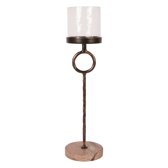 The Rutland Hurricane holds a pillar candle and stands gracefully at 39 cm tall, with a natural forest brown marble base that adds beautiful earthy tones, making each piece unique due to the natural characteristics of marble. The base is complemented by a striking Antique Gold finish, and the hurricane features hammered clear glass, designed to beautifully reflect and diffuse the warm glow of candlelight, creating a soft, flickering ambiance. This sophisticated piece is perfect for adding a touch of class and warmth to any room, blending beautifully with both modern and classic decor styles. The Rutland Pillar Candle Holder is available in four different heights: 39 cm, 45 cm, 92 cm, and 108 cm.