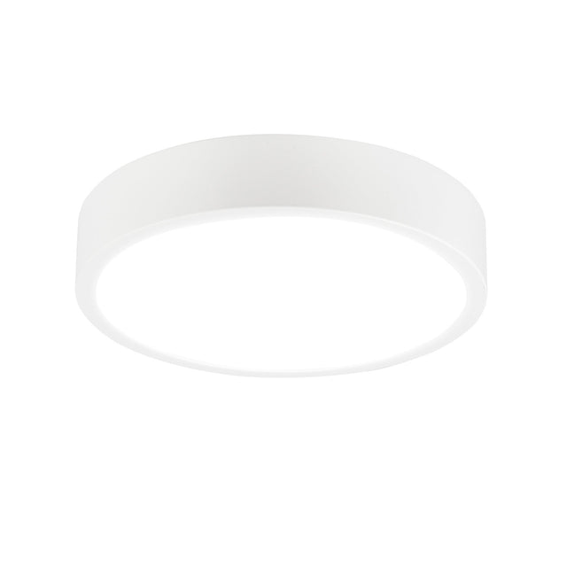 matte white frame. Its circular housing creates a smooth, uninterrupted outline that suits both modern and transitional interiors. At the center, the diffuser spreads light evenly across the surface, forming a bright, uniform glow that highlights the simple geometry of the design. The shallow projection helps it sit close to the ceiling, giving rooms a spacious, open feel while maintaining a refined minimalism.