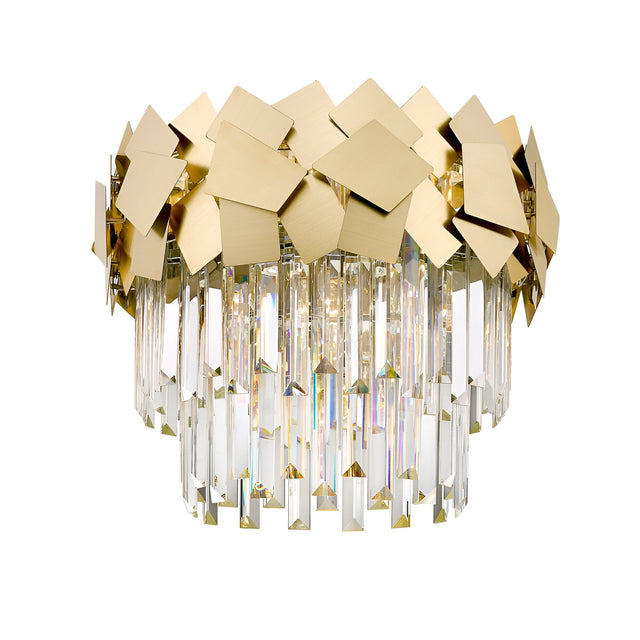 This gold flush ceiling fixture introduces tonal richness and sculptural layering to low-profile spaces. The Selia 5 Light design combines angular laser-cut gold plates with vertically suspended crystal-style rods, forming a structured tier that sits close to the ceiling. The interplay of geometric metalwork and light-catching crystal elements creates a shimmering focal point from above.
