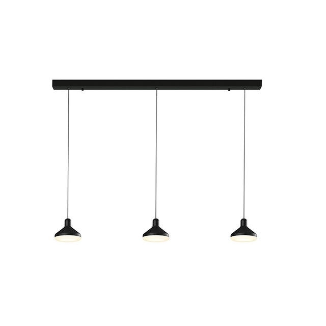 The Sirio 3 Light LED Bar Pendant Light 24W 3000K in Black presents a modern architectural statement through refined geometry and precision lighting. Each conical pendant features a wide surface that optimizes light dispersal, casting a balanced 3000K warm white glow. The trio of pendants is suspended from individual ceiling plates, providing flexibility in layout and configuration, allowing for creative installations beyond the standard linear format. The matte black finish enhances the sculptural form, adding visual depth and contrast suitable for contemporary interiors. Designed with integrated LEDs, the pendant offers efficiency, longevity, and a uniform illumination that enhances both residential and commercial environments. The clean silhouette, combined with the smooth curvature of the cones, establishes a perfect blend of simplicity and sophistication. Sirio exemplifies functionality elevated through design precision, embodying balance, direction, and understated elegance.