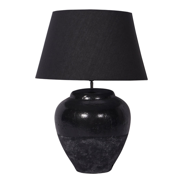 An oversized urn shaped lamp base featuring a curvaceous porcelain base with a rustic black ceramic glaze. This elegant large table lamp will look beautiful in almost any interior, whether classic or contemporary. A shaped shade in black adds the perfect finishing touch.