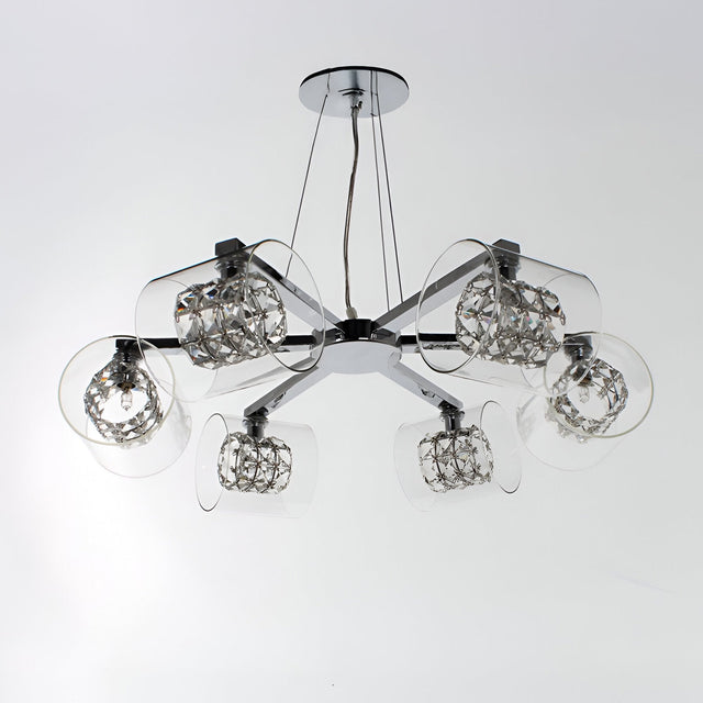 The Sona 6 Light Crystal Suspension Light in chrome delivers symmetry and sparkle in a radial form designed for dining rooms, bedrooms, or transitional spaces. Featuring six equidistant arms that project outward from a central chrome hub, each arm supports a crystal cube encased in a clear cylindrical shade. This layered design allows for visual depth and structured diffusion, with each crystal reflecting surrounding light while remaining grounded by the smooth outer glass.