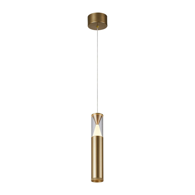 The Spark LED Pendant Light 7W 3000K - Gold captures the balance between precision and opulence. Its elongated cylindrical form exudes simplicity elevated by a luminous gold finish that reflects warmth and refinement. A clear upper section reveals an internal diffuser shaped like a geometric cone, engineered to disperse light evenly while adding architectural interest. The integrated 7W LED emits a 3000K warm white glow, enveloping the surrounding space in a rich, inviting ambiance. Crafted from premium materials, this pendant demonstrates exceptional attention to proportion, finish, and assembly, embodying quality through every detail. Its silhouette complements both classic and modern environments, lending a sense of sophistication to dining spaces, lobbies, or intimate seating areas. When grouped, the pendants create rhythm and depth; when used individually, they stand as minimalist expressions of elegance. The Spark pendant in gold is more than illumination, it is a statement of material beauty and refined craftsmanship.