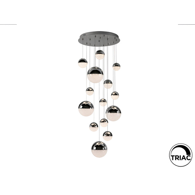 Sphere 14-Light Dimmable LED Small Cluster Pendant delivers a chrome cluster pendant light that turns modest ceiling height into a striking focal point. Fourteen textured polycarbonate globes, finished in mirror-polished chrome, cascade from a compact canopy and refract the warm 3000K glow of the integrated 78W LEDs into shimmering points of light.
