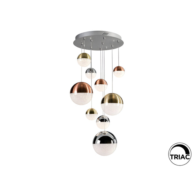 Sphere 9-Light Dimmable Multicoloured Cluster Pendant brings multicoloured cluster pendant light drama to compact interiors. Nine polycarbonate globes, each internally textured for extra sparkle, hang at staggered drops from a slim chrome canopy and are banded in satin copper, satin brass, and chrome for a sophisticated blend of warm and cool metallic tones. Integrated 54W 3000K LEDs bathe rooms in a welcoming glow, and the TRIAC/0-10 V driver pairs with the supplied radio-frequency remote to deliver smooth, flicker-free dimming without wall switches.