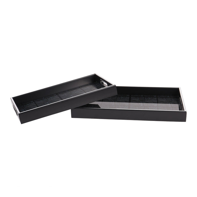 Square designs often convey a sense of balance, symmetry, and order, making them popular choices in architecture, interior decoration, and graphic design. Our Squares pattern is a striking design in silver on a black base. Coasters, rectangular trays, tables and rectangular boxes all available in this design. Large 30 x 45 x 5 ( WxDxH cm ) Small 40 x 25 x 4 ( WxDxH cm )