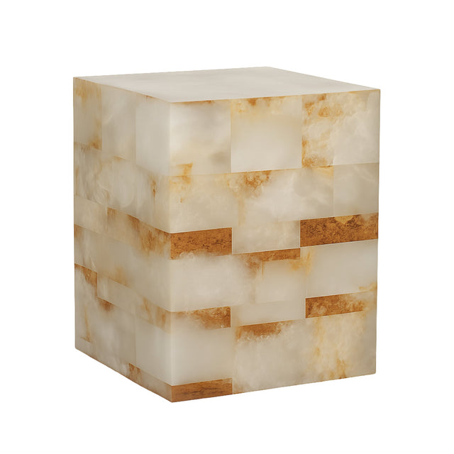 The soft white finish accentuates the organic movement within the alabaster, allowing its inner textures to glow as light passes through. When illuminated, the structure takes on a warm radiance that highlights the intricacies of the stone and gives the form a subtle dimensional depth. The compact height and balanced proportions make it ideal for rooms that require a distinctive accent without overwhelming the surrounding architecture.