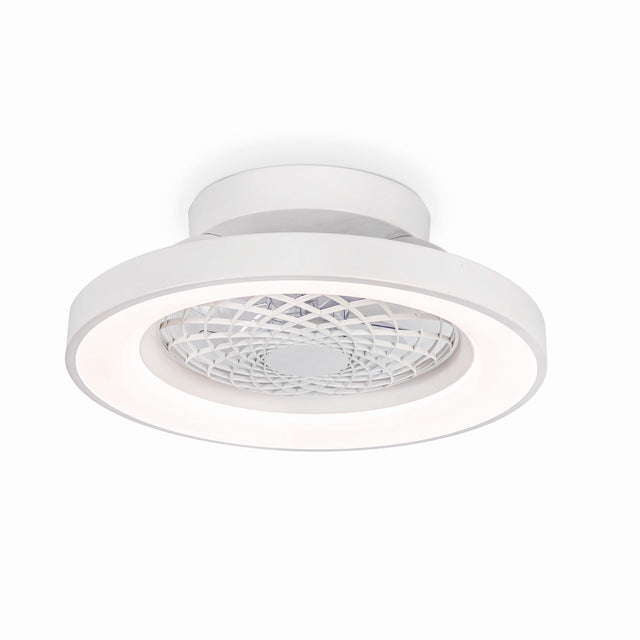 The Tibet Mini Ceiling Fan Light in White expresses minimalism through purity of form and advanced technology. Its circular structure features a fully integrated DC motor and retractable fan blades hidden beneath an intricate grille that adds geometric texture. Surrounding this core lies a soft diffused halo of dimmable LED light, allowing smooth transition between warm and cool tones for tailored ambience. The lighting and fan functions can be adjusted with the supplied remote, offering effortless control over illumination intensity and airflow speed. The flush-mounted design keeps the fixture visually light and seamless, complementing bright, clean interiors while maintaining a strong design presence. The diffuser’s glow accentuates the fan’s subtle architecture, giving the appearance of depth and motion even when static. Built for quiet operation, the Tibet Mini White transforms practical ceiling lighting into a design centerpiece that merges air circulation, ambiance, and minimal form into one cohesive structure.