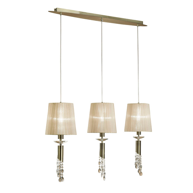 The Tiffany 6 Light Crystal Bar Pendant Light in Brass With Bronze Shades represents luxury through depth, tone, and craftsmanship. Six bronze fabric shades crown an antique brass frame, complemented by strands of cut crystals that cascade below in fluid motion. The bronze hue enhances the richness of the brass, while the crystal accents introduce contrast through sparkle and reflection. The lighting system integrates E27 fittings within the shades and discreet G9 lamps below, producing layered illumination that highlights surfaces with warmth and texture. The overall form is balanced yet commanding, designed to serve as both a functional light source and centerpiece feature. Ideal for high-end interiors, this pendant combines the tactile quality of fabric with the reflective precision of metal and crystal. The Tiffany design encapsulates sophistication, translating traditional opulence into a modern architectural language defined by proportion, material, and light.