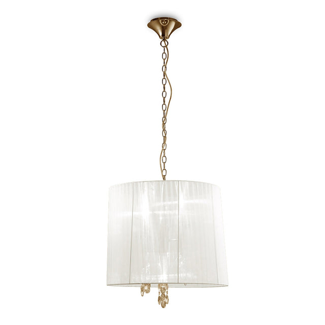 The combination of the warm French gold finish and the crisp white shade produces a refined contrast that emphasizes both clarity and softness. The crystal strands interact with the warm metallic tone, capturing subtle reflections that enrich the pendant’s layered character. The adjustable drop supports balanced placement without disturbing the proportional relationship between shade, tubes, and crystal. This interpretation of the Tiffany design highlights material harmony through warm metal, luminous crystal, and translucent fabric. The pendant demonstrates careful coordination of form, texture, and tone, resulting in a composed and sophisticated lighting piece.