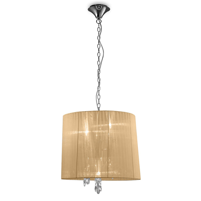The Tiffany 6 Light Crystal Pendant Light in polished chrome with a soft bronze shade presents an elegant combination of structured metalwork, layered crystal detail, and a refined fabric envelope. The polished chrome frame supports an upper tier of angled tubes arranged in a circular formation, each tube shaped with a smooth reflective surface that directs light downward toward the lower assembly. Beneath this tier, strands of clear cut crystals descend in carefully placed sequences, forming a soft cascade that brings depth and textural richness. Surrounding this interior composition is a soft bronze shade crafted from delicately woven material, its surface revealing subtle vertical texture that allows the internal structure to remain visible while gently diffusing the illumination. The 500 millimeter diameter creates a balanced silhouette that highlights shade and crystal equally.