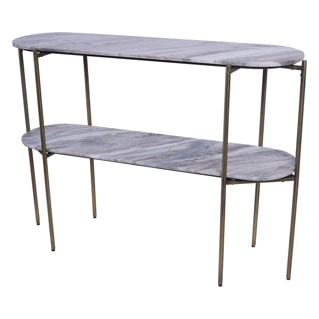 The Toronto Marble Console Table features a design defined by clean, minimalist lines. The polished marble top, with rounded ends, showcases predominant grey and white marbling, beautifully complemented by subtle veins of taupe and soft browns. The iron frame, finished in an antique brass colour, features slim metalwork and rounded edges, allowing the marble to take centre stage. This console table makes a striking yet understated statement in any space. It is part of a three-piece collection that includes a Console Table, Coffee Table, and Side Table.