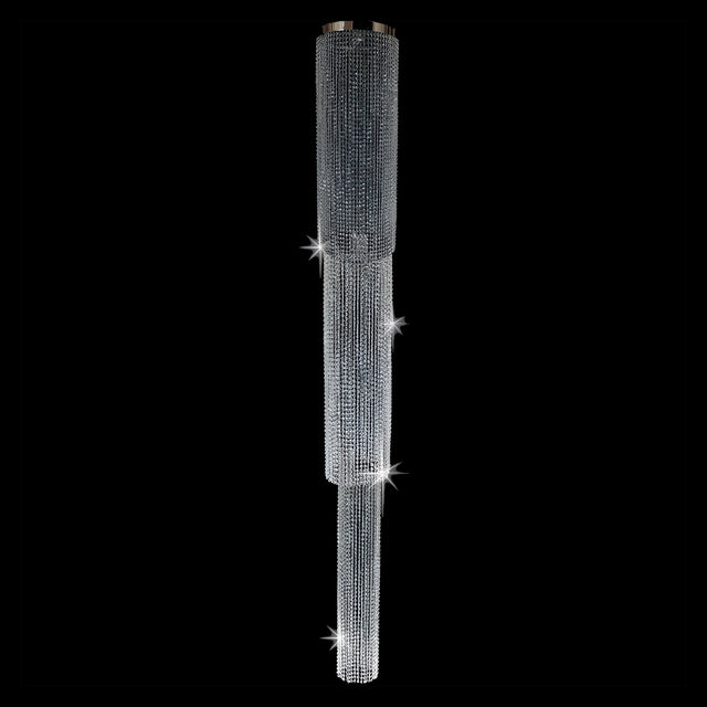 This verticality makes the chandelier ideal for spaces with very high ceilings that demand uninterrupted visual flow. The chrome finish sharpens the clarity of each faceted chain, amplifying reflectivity while maintaining a cool contemporary tone. Despite its scale, the design maintains a clean architectural discipline, making it compatible with minimalist interiors seeking sculptural contrast.